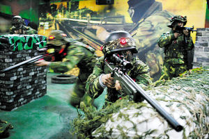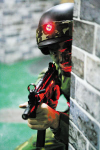 該團組建于1951年,參加過抗美援朝戰(zhàn)斗,是一支能征善戰(zhàn)的部隊。為提高訓(xùn)練效益,該團借鑒CS網(wǎng)絡(luò)游戲模式,以城市巷戰(zhàn)為背景,通過點光、面光、導(dǎo)向照明及數(shù)碼成像相結(jié)合的燈光設(shè)計,使一個對抗系統(tǒng)能夠滿足黃昏、白晝、黑夜三種作戰(zhàn)環(huán)境需求。為最大限度接近實戰(zhàn)模擬,系統(tǒng)配備了激光仿真槍、頭盔、馬甲、仿真手雷、匕首等器材和用來記錄成績、設(shè)置子彈數(shù)量、游戲人員生命次數(shù)及對抗時間的控調(diào)設(shè)備,勝負成敗一目了然。為突出戰(zhàn)法運用,在場地設(shè)計上采用可移動實景戰(zhàn)術(shù)障礙物的設(shè)計,高板與矮墻結(jié)合、既設(shè)布景與就便器材并用,戰(zhàn)場環(huán)境可隨機調(diào)整,使每次對抗都能在一個全新的環(huán)境中進行。