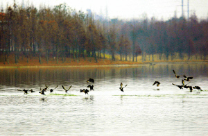 海灣國家森林公園位于奉賢區(qū)五四農(nóng)場境內(nèi),目前一期工程已完成90%,建成后將是上海規(guī)模最大的森林公園,預(yù)計年內(nèi)可試開放。公園擁有大面積接近自然生態(tài)的森林和上海最大的人工湖泊——百鳥湖。園內(nèi)種植了350多種400多萬棵樹木。圖為上午百鳥湖上野鴨飛舞 本報記者 紀海鷹 通訊員 周沅生 攝影報道