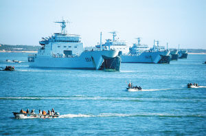 “按新大綱施訓(xùn),聯(lián)合是個重頭戲。但是,以往高層指揮機(jī)構(gòu)聯(lián)訓(xùn)較多,基層部隊聯(lián)訓(xùn)不夠。這種做法,容易造成聯(lián)合訓(xùn)練‘有想法沒辦法’,使得基層部隊聯(lián)訓(xùn)就像捆籬笆,拴在一起也是貌合神離,經(jīng)不起風(fēng)雨。今年按綱施訓(xùn),我們力求解決這個問題,大力提高一線指戰(zhàn)員的聯(lián)合素質(zhì)!蓖踔ш犻L話音剛落,只見熒屏上出現(xiàn)精彩一幕:登陸艦抵達(dá)泛水點,帆纜業(yè)務(wù)長、四級士官羅曉春組織帆纜兵開大門、展吊橋,指揮兩棲坦克泛水;當(dāng)?shù)顷懕粨舻顷憰r,遭到“敵”灘頭火力猛烈阻擊,“海洋山”艦艦長鄧先武果斷命令艦炮進(jìn)行火力支援,發(fā)發(fā)炮彈將“敵”地堡掀上半空……