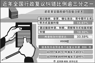 “行政復(fù)議化解行政爭議的作用日益明顯。”2月19日,國務(wù)院法制辦主任曹康泰在全國行政復(fù)議工作經(jīng)驗(yàn)交流暨“雙先”、“雙優(yōu)”表彰大會(huì)上介紹,2008年,國務(wù)院共收到行政復(fù)議申請(qǐng)866件,比2006年增長近90%,全國每年通過行政復(fù)議化解的行政爭議約8萬件左右。