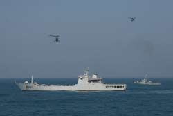 “艦艇編隊高速接近目標(biāo),保持距離進(jìn)行跟蹤監(jiān)視;艦載機(jī)繼續(xù)進(jìn)行跟蹤飛行!焙I现笓]員、基地副參謀長黃鳳至果斷下達(dá)指令,并向上級申請:“電子對抗部隊用短波對被劫持貨輪短波通信實(shí)施干擾;協(xié)調(diào)地方網(wǎng)管中心屏蔽恐怖分子IP地址,阻截與外部的通訊聯(lián)系和信息發(fā)送!