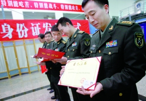 海淀分局人口處民警介紹,去年4月開始,經(jīng)國務(wù)院、中央軍事委員會同意,在全國范圍內(nèi)為現(xiàn)役軍人和武警部隊(duì)官兵發(fā)放軍人身份證,北京作為試點(diǎn)單位自去年6月先期為駐京部隊(duì)發(fā)放。軍人、武警官兵在社會活動中,如買房、買車、貸款等都可持居民身份證辦理。(記者田北北)