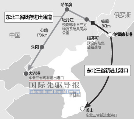 這是東北最大最繁忙的航線。韓國(guó)《朝鮮日?qǐng)?bào)》近日?qǐng)?bào)道,中國(guó)、韓國(guó)和俄羅斯正聯(lián)手構(gòu)建新的“中韓俄三角物流系統(tǒng)”。一座20萬(wàn)平方米的內(nèi)陸集裝箱貨場(chǎng)將在黑龍江省綏芬河市落成,中國(guó)北方的進(jìn)出口貨物將悉數(shù)集中在這里,然后用鐵路運(yùn)往俄羅斯納霍德卡港,通過(guò)海運(yùn)運(yùn)到韓國(guó)釜山港。