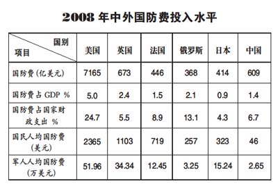 首先,應當看到中國國防費的投入是適度有限的。近年來,中國的國防費有了較大幅度的增長,似乎中國的國防費已經(jīng)很多了,但如果以歷史的、聯(lián)系的,而不是以孤立的、片面的觀點,來審視和分析中國的國防費問題,就會得出一個中國的國防費投入實際上并不多的客觀結(jié)論。從歷史上看,中國國防費投入的增長帶有明顯的補償性。根據(jù)國家統(tǒng)計局有關(guān)公開資料,從1979年到1989年,國防費平均增長為1.23%,與同期居民消費價格總指數(shù)平均上漲7.49%相比,實際年平均負增長超過6%。從1990年到1997年國防費年均增長15.8%,而同期居民消費價格總指數(shù)平均上漲9.7%,中國國防費排除物價因素后實際年均增長只有6.1%。直到1998年國家物價指數(shù)比較平穩(wěn)之后,為降低長期經(jīng)費不足給國防和軍隊建設(shè)帶來的影響,國防費投入才逐步有了較大幅度的實際增長。在長達10多年的“忍耐”過程中,中國國防和軍隊建設(shè)因經(jīng)費不足而受到很大影響。從中國自身的情況看,中國國防費的支出也是極其有限的。以這次兩會公布的有關(guān)數(shù)字為例,2009年中國國防費預算比上一年度執(zhí)行數(shù)增加了14.9%,占全國財政支出預算的6.3%,與前幾年相比,所占比重略有下降,而同期教育費增長22.5%、醫(yī)療衛(wèi)生費增長20.9%、社會保障和就業(yè)費增長23.1%、環(huán)境保護費增長22.3%、保障性安居工程經(jīng)費增長199.6%,可見國防費的增長在各項社會事業(yè)費的增長中是相對偏低的,中國始終堅持把主要的財力用于改善民生。再從國際上看,中國與美、英、法、俄、日等國家相比,無論是國防費占國家國內(nèi)生產(chǎn)總值(GDP)的比重還是占國家財政支出的比重,無論是國民人均國防費還是軍人人均國防費投入等主要指標都是比較低的(如右表所示)。