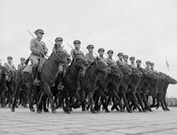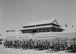 阿木古楞:受閱壓力很大,覺得在天安門接受毛主席檢閱,比打錦州沖鋒陷陣還緊張啊。記得閱兵總指揮楊成武在會(huì)上對各部隊(duì)指揮員說,誰的馬驚了,就撤團(tuán)長的職。我們真擔(dān)心出岔子啊。部隊(duì)訓(xùn)練很刻苦,士兵很下功夫。在北京駐訓(xùn)時(shí)正是炎夏,北京熱呀。我們騎兵常年駐在草原,涼快慣了,熱得人和馬都受不了。我們每天早上4時(shí)起床,5時(shí)就開始訓(xùn)練,練到10時(shí)才休息,下午接著練,一直練到黃昏。特別是馬不好練。我們的馬都是從戰(zhàn)場上下來的,打仗可以,騎手雙腿一夾,馬撒腿就往上沖,現(xiàn)在不行,必須步伐整齊。要踩著音樂,跟上拍子。