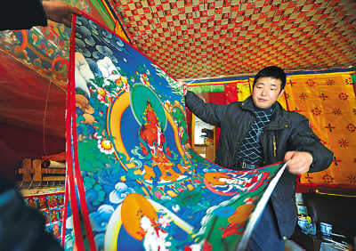 近年來,中國開展的一系列藏文化宣傳活動(dòng)對藏文化的傳播也產(chǎn)生了很大的影響。拉姆說,自《藏謎》上演以后,很多顧客上門,點(diǎn)名要買楊麗萍在其中所扮演的度母為主題的唐卡。