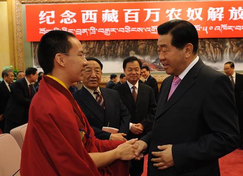 中新網(wǎng)北京3月27日電 紀(jì)念西藏百萬(wàn)農(nóng)奴解放50周年座談會(huì)27日在北京人民大會(huì)堂舉行。中共中央政治局常委、全國(guó)政協(xié)主席賈慶林出席并講話。