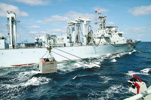 經(jīng)過9天9夜的航行,今天(注:11日)上午,海軍第二批護(hù)航編隊的“深圳”號導(dǎo)彈驅(qū)逐艦和“黃山”號導(dǎo)彈護(hù)衛(wèi)艦,在阿拉伯海與前出接應(yīng)的第一批護(hù)航編隊的“微山湖”號綜合補給艦會合,并實施了補給。