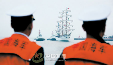 彩旗在風(fēng)中飄揚(yáng),禮炮在空中響起。4月18日晚7時(shí)許,美麗的青島港迎來(lái)了參加中國(guó)海軍60周年慶典的第一位“客人”——墨西哥的“夸烏特莫克”號(hào)風(fēng)帆訓(xùn)練艦。慶祝中國(guó)海軍成立60周年多國(guó)海軍活動(dòng),由此拉開了帷幕。