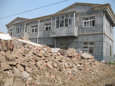 在現(xiàn)場,記者看到,在迎賓大道路東第一棟別墅后面,一排平房已被拆成廢墟。據(jù)房主李某介紹,由于沒有土地證,他的房子去年就被拆除了,“但前面的別墅同樣沒有土地證,為什么完好無損?”據(jù)了解,李某房前別墅的主人是二隊(duì)書記于某。