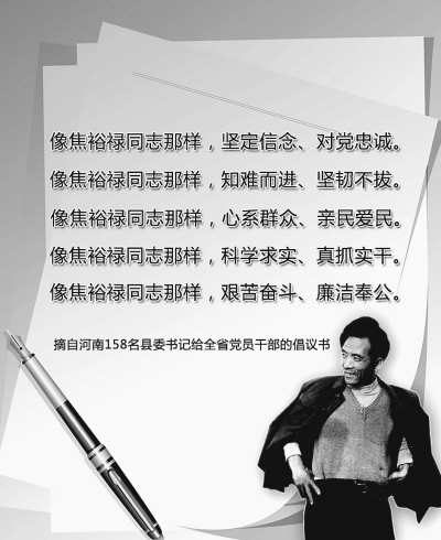 在“縣委書記的好榜樣”焦裕祿同志逝世45周年之際,河南158名縣(市、區(qū))委書記聯(lián)名發(fā)出倡議,要像焦裕祿同志那樣,心系群眾、親民愛民,艱苦奮斗、無(wú)私奉獻(xiàn),堅(jiān)持以廉為重、正派做人,不為名利所困、不為物欲所誘、不為人情所擾,真正做到權(quán)為民所用、情為民所系、利為民所謀,爭(zhēng)做焦裕祿式好干部,爭(zhēng)創(chuàng)焦裕祿式業(yè)績(jī)。
