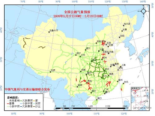 中新網(wǎng)5月27日電 中國(guó)氣象局與交通運(yùn)輸部今日聯(lián)合發(fā)布“端午節(jié)”期間主要公路氣象預(yù)報(bào)。