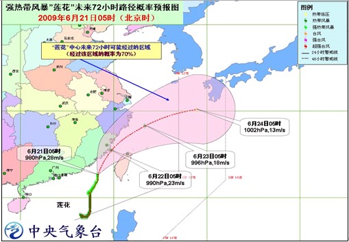 預計,“蓮花”將以每小時15公里左右的速度向北偏東方向移動,逐漸向福建福清到漳浦一帶沿?拷,有可能于今天下午到夜間在這一帶沿海登陸;也有可能擦過福建省近海海面,沿臺灣海峽向東北方向移動,強度逐漸減弱。