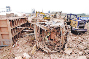廠區(qū)四周的圍墻已經(jīng)多處出現(xiàn)了爆破后的破損,廠子的西圍墻部位,被掀翻后的辦公樓的混凝土砸出了近20米的缺口,破損的石塊下,不時還可以看到被撕破的衣服和鞋子等物。工廠大門口,一輛轎車被沖擊波完全擊碎,連什么品牌都無法辨認。