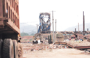 進入爆炸現(xiàn)場,偌大的廠區(qū)幾乎被夷為平地,已經(jīng)看不到一間完好的房子,到處是瓦礫和木屑,以及破裂變形的運輸車輛和職工宿舍里散落的臉盆、牙缸等。周圍的樹木全被削去了樹葉而變得光禿禿的,仿佛冬天一般肅殺。