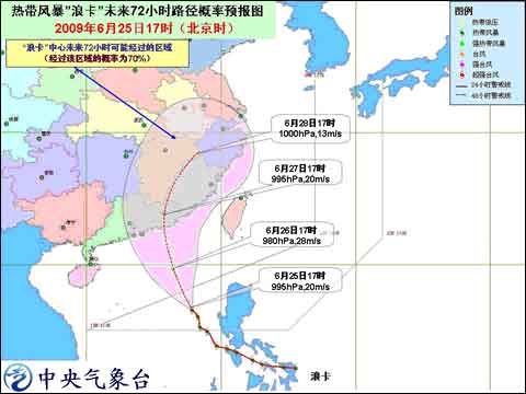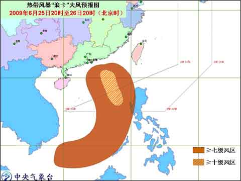 預計,風暴中心將以每小時15-20公里的速度向西北方向移動,以后將轉(zhuǎn)向偏北方向移動,逐漸向廣東中部到福建南部一帶沿?拷,強度有所加強,并有可能于明天夜間到后天白天在這一帶沿海登陸。受“浪卡”和西南季風的共同影響,今天晚上到明天白天,南海東部和南部海面將有6-8級大風,“浪卡”中心經(jīng)過的附近海面的風力可達9-10級。