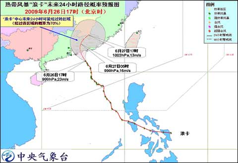 今年第4號(hào)熱帶風(fēng)暴“浪卡”(NANGKA)的中心今天下午5時(shí)位于廣東省惠東縣南偏東大約140 公里的南海北部海面上,就是北緯21.4度、東經(jīng)115.3 度,中心附近最大風(fēng)力有9級(jí)(23米/秒)。
