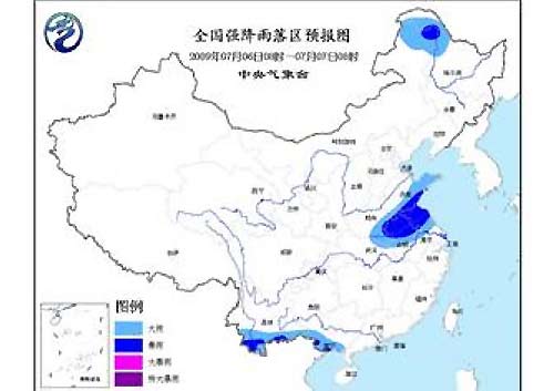中新網(wǎng)7月6日電 中央氣象臺(tái)6日06時(shí)發(fā)布暴雨預(yù)報(bào):預(yù)計(jì)今天白天到夜間,內(nèi)蒙古東北部、黑龍江西北部、山東南部和東部、河南南部、蘇皖中北部、云南南部、廣西南部等地的部分地區(qū)有大雨。