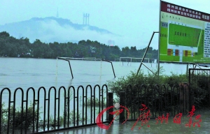 被譽為中國足球“明星搖籃”和培養(yǎng)中國足球裁判員“黃埔軍校”的廣西梧州體育訓練基地,位于緊臨西江的梧州市蝶山區(qū)龍湖鎮(zhèn),是原國家體委與地方共建的全國三大足球訓練基地之一。前日以來,隨著西江水位的不斷上漲,該體育訓練基地開始不斷被水蔓延。昨日下午,記者趕到時,上百畝訓練場地全部被大水淹沒,水深處達兩米多,球場只露出一截40多個球門,讓人們還能認得出來這里原來是一處足球場地。同時,記者也看到附近居民的房屋的一樓已經(jīng)泡在水中。(記者王廣永)