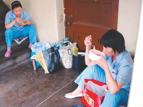 兩名護(hù)工在醫(yī)院走廊里解決晚餐。護(hù)工24小時(shí)陪在病人身邊,每天中午和傍晚兩個(gè)時(shí)段,分別可以抽出40分鐘解決吃飯問(wèn)題,只有這一刻,是屬于他們自己的時(shí)間。