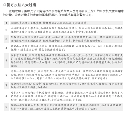 帖子中,伍皓披露云南省政法系統(tǒng)有關(guān)負(fù)責(zé)人在聽取調(diào)查進(jìn)展報告過程中,“用了半個多小時詳細(xì)指出公安機(jī)關(guān)的過錯”。“當(dāng)案情逐漸清晰,特別是查出劉家的兩個女兒互換衣服、故意誘導(dǎo)聯(lián)防抓錯人以實(shí)施敲詐的情節(jié),基層公安機(jī)關(guān)都覺得松了一口氣,有人在匯報中說‘看來案子并沒有辦錯’,有關(guān)負(fù)責(zé)人立即怒目圓瞪、厲聲喝斥,‘什么沒有辦錯!這個案子,我們公安機(jī)關(guān)是有過錯的’!”