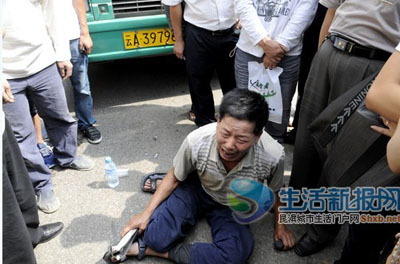 一名50多歲的男子擋在一輛77路公交車前,坐在地上痛哭,民警怎么勸說他也不愿意離開。男子稱:“這些城管太不講道理了,他們快把我的兒子打死了。”據(jù)該男子介紹,20多名城管人員昨日早上將其兒子打傷,兒子被送進(jìn)醫(yī)院搶救,而打人的城管全部跑了,“實(shí)在是沒有辦法,我兒子不能白白受罪,無奈之下,我只能通過這種方法引起相關(guān)部門的重視。”