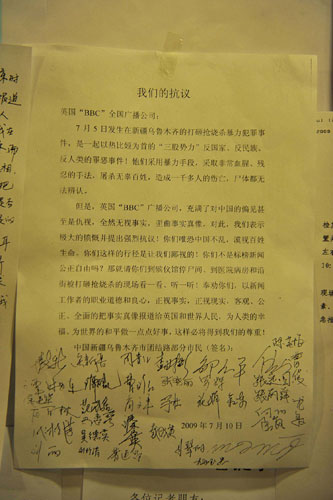 7月13日上午,當(dāng)記者來到設(shè)在烏魯木齊海德飯店的新聞中心時,這里的工作人員反映說,連日來他們不斷接到當(dāng)?shù)厥忻翊騺淼碾娫,反映西方媒體關(guān)于“7·5”事件的報道不但有失公充,而且無視基本事實(shí),他們要求工作人員將他們的不滿和抗議轉(zhuǎn)告給相關(guān)的西方媒體記者。有些市民是直接將他們抗議信送到新聞中心,將其貼在那里。