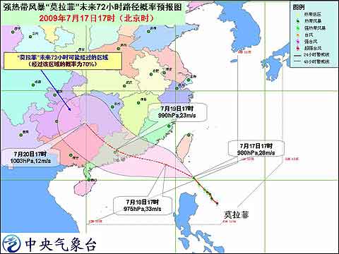 據(jù)中央氣象臺(tái)18日18時(shí)發(fā)布臺(tái)風(fēng)橙色緊急警報(bào)稱,今年第6號(hào)臺(tái)風(fēng)“莫拉菲”的中心18日17時(shí)位于廣東省深圳市東偏南方大約225公里的海面上,就是北緯22.0度、東經(jīng)116.7度,中心附近最大風(fēng)力有12級(jí)。預(yù)計(jì),“莫拉菲”將以每小時(shí)25公里左右的速度向西偏北方向移動(dòng),將于18日夜間到19日早晨在廣東汕尾到臺(tái)山一帶沿海登陸,登陸后強(qiáng)度將逐漸減弱。 受“莫拉菲”及其外圍云系的影響,18日夜間到19日白天,東海南部海面、臺(tái)灣海峽、巴士海峽、巴林塘海峽、臺(tái)灣以東洋面、南海大部海面、臺(tái)灣省及其沿海、福建沿海、廣東南部將有7-9級(jí)大風(fēng),“莫拉菲”中心經(jīng)過的附近海面或地區(qū)的風(fēng)力可達(dá)10-12級(jí),部分海域和地區(qū)陣風(fēng)可達(dá)13-14級(jí);廣東大部、廣西東部以及福建東南部等地有暴雨,部分地區(qū)有大暴雨,其中,廣東東部沿海局地有特大暴雨。