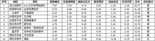 說明:本表數(shù)據(jù)為11位輿情分析師采用德爾菲法,對(duì)地方政府應(yīng)對(duì)網(wǎng)絡(luò)輿情表現(xiàn)進(jìn)行分項(xiàng)評(píng)估后得出。其中政府響應(yīng)、信息透明度、政府公信力三項(xiàng)為常規(guī)指標(biāo),分值區(qū)域分別為-10~10分;恢復(fù)秩序、動(dòng)態(tài)反應(yīng)、官員問責(zé)三項(xiàng)為特殊指標(biāo),分值區(qū)域分別為-5~5分、-3~3分、-3~3分。輿情分析師依據(jù)以上各項(xiàng)指標(biāo)對(duì)政府表現(xiàn)分別做出評(píng)價(jià),政府表現(xiàn)越出色、應(yīng)對(duì)越得體則得分越高,反之則得分越低。最終依據(jù)各項(xiàng)表現(xiàn)綜合所得總分,得出藍(lán)、黃、橙、紅四級(jí)警報(bào)級(jí)別,警報(bào)程度相應(yīng)由低到高。其中總分20.00分以上為藍(lán)色警報(bào),政府應(yīng)對(duì)總體較為得體;總分15.00~19.99分為黃色警報(bào),政府應(yīng)對(duì)有待進(jìn)一步加強(qiáng);總分10.00~14.99為橙色警報(bào),政府應(yīng)對(duì)存在明顯問題;總分10.00分以下為紅色警報(bào),政府應(yīng)對(duì)嚴(yán)重失當(dāng),存在重大缺陷。