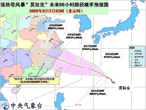 預(yù)計,“莫拉克”將以每小時15-20公里的速度向西偏北方向移動,強(qiáng)度繼續(xù)加強(qiáng),今天白天對中國近海無影響。