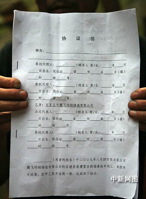 該家屬向記者出示了一份空白的“救助”協(xié)議書,協(xié)議書上的乙方為石家莊騰飛瑪鋼鑄造有限公司。該死者家屬說,今天上午10點(diǎn)多,有村委會(huì)干部和鄉(xiāng)鎮(zhèn)干部找到他,要求他簽署這份協(xié)議書。