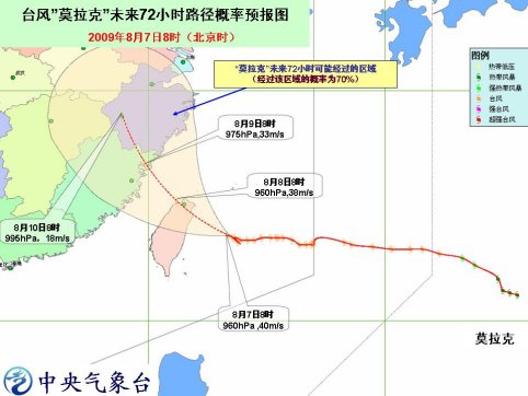 預(yù)計(jì),“莫拉克”將以 每小時(shí) 15 公里左右的速度向西北方向移動(dòng),將于今天 傍晚前后登陸臺(tái)灣東北部,然后向福建北部到浙江中部一帶沿海靠近,并有可能于明天下午到后天早晨在向福建北部到浙江中部一帶沿海登陸。