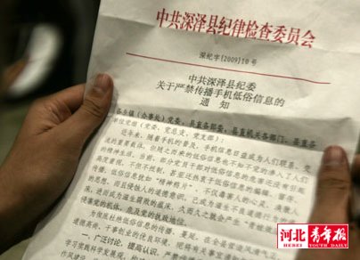 記者了解到,深澤縣委常委、紀(jì)委書記張慶民是此事的主要推動(dòng)者之一。在他們的推動(dòng)下,經(jīng)多次討論,并向深澤縣委多次匯報(bào)后,才出臺(tái)了“嚴(yán)禁傳播手機(jī)低俗信息的通知”。