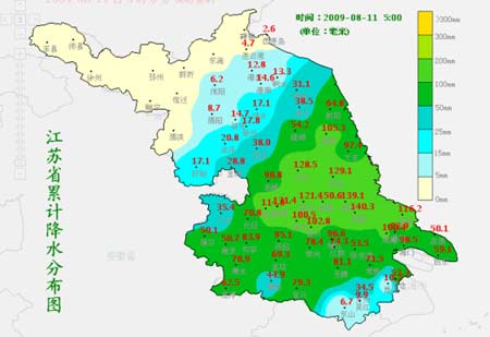 受“莫拉克”影響,10日江蘇淮河以南地區(qū)出現(xiàn)大范圍暴雨到大暴雨。據(jù)統(tǒng)計(jì),截至11日05時(shí), 江蘇38個(gè)臺(tái)站24小時(shí)雨量在50毫米以上,其中南通、泰州、鹽城、鎮(zhèn)江、揚(yáng)州共14個(gè)臺(tái)站在100毫米以上,最大雨量出現(xiàn)在姜堰(150.6毫米)。另據(jù)加密自動(dòng)站觀測,有118個(gè)站雨量在100毫米以上,最大雨量姜堰蔣垛(179.3毫米)!澳恕边使淮河以南地區(qū)普遍出現(xiàn)7-8級(jí)大風(fēng),沿海9-10級(jí),最大風(fēng)速達(dá)11級(jí) (28.6m/s,射陽丹頂鶴保護(hù)區(qū))。