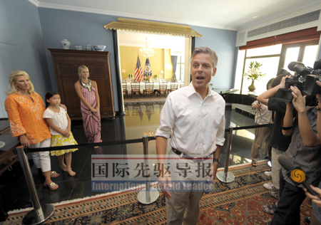 8月22日,洪博培開(kāi)始了上任美國(guó)駐華大使的第一天工作,而第一項(xiàng)任務(wù)就是在中外記者面前亮相。記者會(huì)時(shí)間一到,洪博培就帶著家人健步走來(lái),雖然年近50歲,已有些銀絲出現(xiàn),但記者站在洪博培面前,感覺(jué)到的卻是年輕和朝氣。