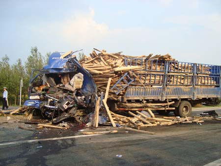 記者趕到現(xiàn)場時看到,現(xiàn)場已經(jīng)設(shè)立了警戒線,一輛白色大客車頭部扎進(jìn)路邊溝內(nèi)樹林,頂著兩棵小樹,只有后輪還搭在柏油路上?蛙嚽安颗で,車頂蓋被掀起,風(fēng)擋玻璃破碎,車前部、地上、車內(nèi)到處可以看到斑斑血跡,還有一些零碎物品。在距離客車車尾4米左右,一輛拉著木板的藍(lán)色貨車車頭朝向松原方向停放在路上,車前部全部凹陷進(jìn)去,里面有大量血跡,車上木頭散落一地。