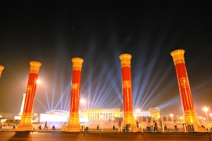 新中國(guó)成立六十周年國(guó)慶大典背景總策劃及總制作人路健康介紹說,安置在廣場(chǎng)上的“民族團(tuán)結(jié)柱”不僅點(diǎn)綴了人民大會(huì)堂與歷史博物館中間的空間,同時(shí)突破了以往慶典的平面布局,使其更附有景觀結(jié)構(gòu)感,更具有節(jié)日氣氛。