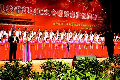由省直機(jī)關(guān)工委主辦的“歌唱祖國(guó)——省直機(jī)關(guān)干部職工大合唱”競(jìng)賽活動(dòng),是省委、省政府慶祝新中國(guó)成立60周年系列慶典的重要內(nèi)容。自今年6月啟動(dòng)以來(lái),省領(lǐng)導(dǎo)高度重視,各部門(mén)大力支持,廣大干部職工積極響應(yīng),共組織100支隊(duì)伍、8000余人參賽,1萬(wàn)多名干部職工到現(xiàn)場(chǎng)觀摩,省委書(shū)記羅清泉、省長(zhǎng)李鴻忠等省領(lǐng)導(dǎo)和省直各部門(mén)主要負(fù)責(zé)同志帶頭參加演唱。參加匯報(bào)演出的22支隊(duì)伍,代表省直各條戰(zhàn)線,用精彩的演出,唱響共產(chǎn)黨好、社會(huì)主義好、改革開(kāi)放好、偉大祖國(guó)好、各族人民大團(tuán)結(jié)好的主旋律,展示了省直機(jī)關(guān)干部職工良好的精神風(fēng)貌。(記者徐和平、通訊員胡振剛)