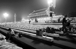 測(cè)量、吊線、打眼、擰螺絲……昨日下午5時(shí)許,天安門城樓前東西兩側(cè)臨時(shí)觀禮臺(tái)的紅地毯上,工人正將一排排乳白色“木盒”與地面固定。