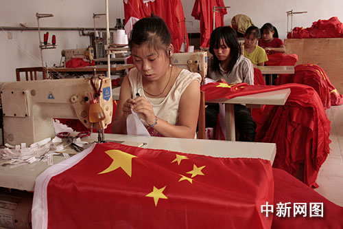 中新網(wǎng)石家莊9月26日電 (記者 徐艷輝 王穗)隨著國慶60周年日益臨近,全國各地的“紅妝”越來越濃,國旗也變得越來越搶手。25日,記者在河北省有名的“紅旗村”——藁城市梅花鎮(zhèn)屯頭村了解到,廠家不僅開足馬力生產(chǎn),而且有的廠家通過空運,盡快將國旗發(fā)往全國各地。