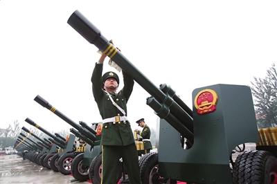 當(dāng)天上午9時30分,武警北京總隊某部京郊某訓(xùn)練場。秋雨剛過,訓(xùn)練場上的60門禮炮(其中4門為預(yù)備炮)著新刷不久的綠漆,雁翅分開,昂然而立。9時40分左右,“就炮!”隨著一聲口令,百余名武警戰(zhàn)士兩人一組站到禮炮后面。