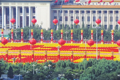昨天的背景文字包括“中華人民共和國萬歲”“中國共產(chǎn)黨萬歲”“人民萬歲”“社會(huì)主義好”等,圖案包括金黃色麥田、五星紅旗、盛開的牡丹、長城、和平鴿等,而巨幅國畫《江山如此多嬌》,尤其令人印象深刻。