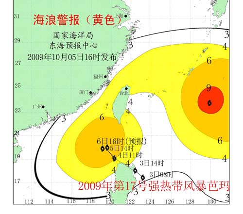 受今年第17號(hào)強(qiáng)熱帶風(fēng)暴“芭瑪”影響,預(yù)計(jì)今天夜間到明天白天:福建沿海和浙江南部沿海仍有2.8米到3.9米的大浪;臺(tái)灣海峽仍有4.0米到6.0米的巨到狂浪;東海南部仍有3.0米到4.5米的大到巨浪;東海北部將出現(xiàn)2.5米到3.5米的大浪;東海東部將出現(xiàn)3.5米到5.5米的大到巨狼。