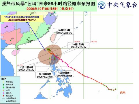 中新網(wǎng)10月6日電 中央氣象臺6日6時發(fā)布臺風預報稱,今年第17號強熱帶風暴“芭瑪”將以每小時10公里左右的速度向南偏東方向移動,并將于6日下午到夜間在菲律賓呂宋島北部沿海登陸,強度緩慢減弱。