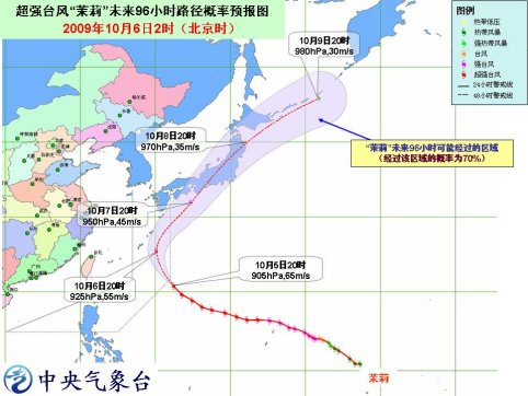 另外,今年第18號超強臺風“茉莉”的中心6日2時位于日本沖繩島那霸東南方大約750公里的西北太平洋洋面上,就是北緯21.1度、東經(jīng)132.5度,中心附近最大風力仍有17級以上(65米/秒),中心最低氣壓為905百帕。
