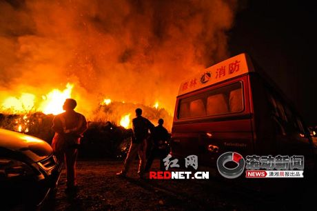 8日晚9點左右,記者趕到現(xiàn)場。在永和鎮(zhèn)內(nèi)即可看到遠(yuǎn)遠(yuǎn)一山頭火光沖天,循著火光記者找到了事發(fā)點。此時爆炸點附近已被封閉,現(xiàn)場救援人員正在點燃路邊的雜草,火勢越燒越旺,瞬間整個山頭都被大火覆蓋,半邊天空都被燒紅了。