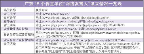 記者從省委辦公廳網絡信息資源處了解到,目前設立“網絡發(fā)言人”的15個省直部門是:省教育廳、省公安廳、省監(jiān)察廳、省勞動和社會保障廳、省國土資源廳、省建設廳、省交通廳、省衛(wèi)生廳、省審計廳、省環(huán)保廳、省工商局、省質量技術監(jiān)督局、省食品藥品監(jiān)督管理局、省安全生產監(jiān)督管理局、省信訪局。“網絡發(fā)言人”的主要職責是:定期收集處理本單位網站和人民網、南方網、奧一網上留言板或問政平臺上網友的留言。
