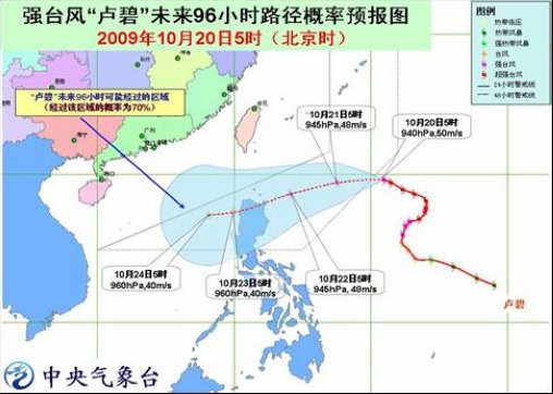 受“盧碧”和南下冷空氣的共同影響,20日白天至夜間,東海東部、臺灣以東洋面、臺灣海峽、巴士海峽、巴林塘海峽、南海東北部的風力將逐漸加大到7-9級,部分海域陣風可達10-11級,“盧碧”中心經過的附近海域的風力有11-15級。