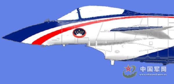 殲-10表演隊(duì)的隊(duì)徽采用兩個(gè)鑲嵌的橢圓,中間是6架戰(zhàn)鷹,在兩個(gè)橢圓之間下部噴涂“空軍八一飛行表演隊(duì)”字樣。 隊(duì)徽顏色采用紅、黃、藍(lán)、白四種顏色。噴涂在機(jī)頭左右兩側(cè),共2處(見圖12、13)。