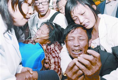 現(xiàn)場(chǎng),有些失控。工作人員死死拉住陳崇香、涂月熙,并說(shuō):“節(jié)哀,節(jié)哀!”突然,傷心欲絕、痛哭中吐不過氣來(lái)的涂月熙昏倒在地,正在追悼會(huì)大廳負(fù)責(zé)醫(yī)療的荊州市醫(yī)護(hù)人員,趕緊過來(lái)給她輸氧搶救。